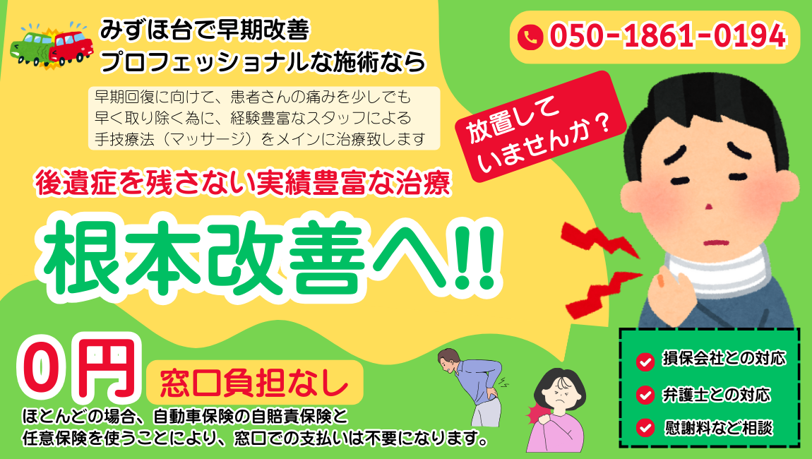 ムチウチなどの症状は初期段階での施術が非常に重要ですので、ぜひ当院にご相談ください。